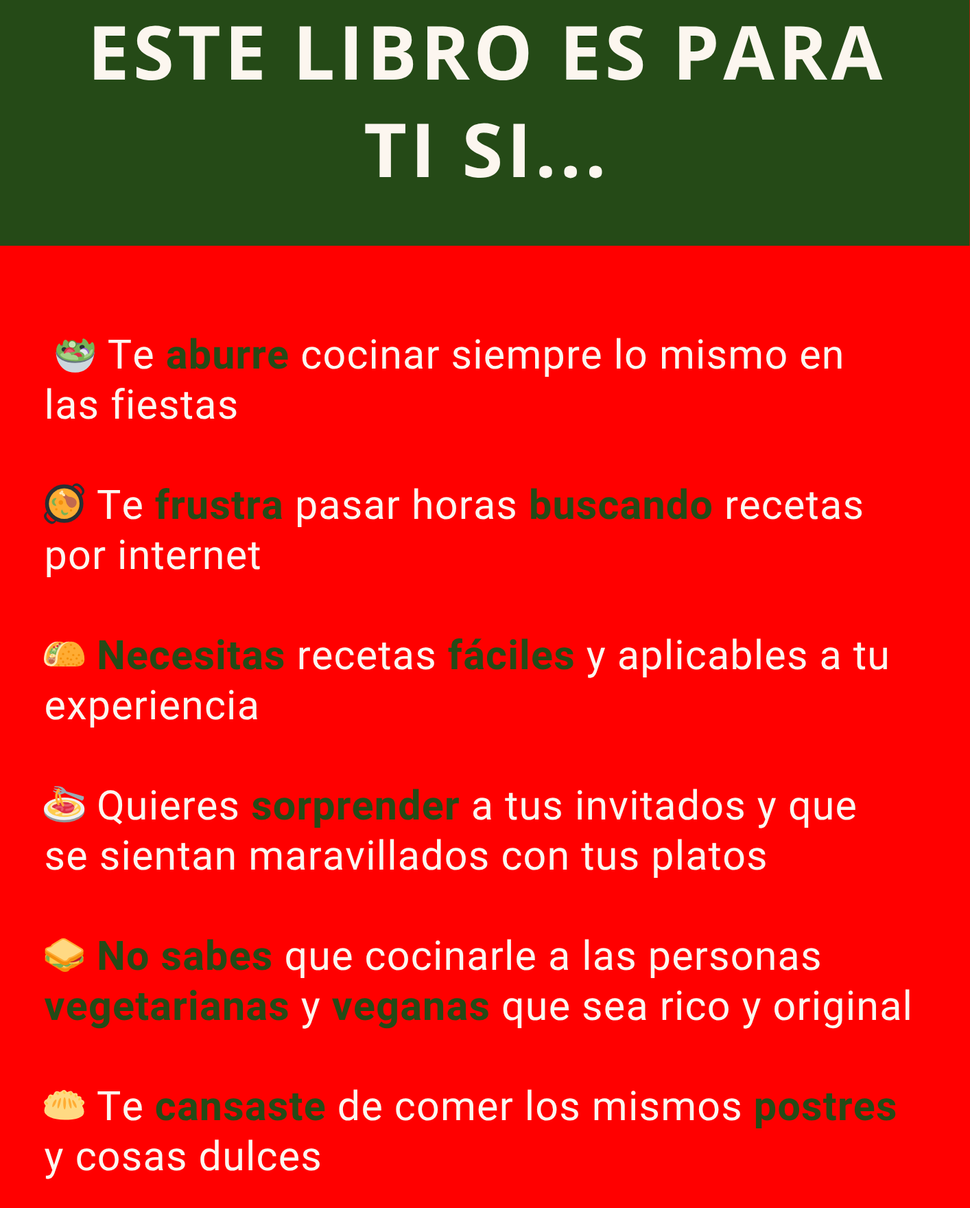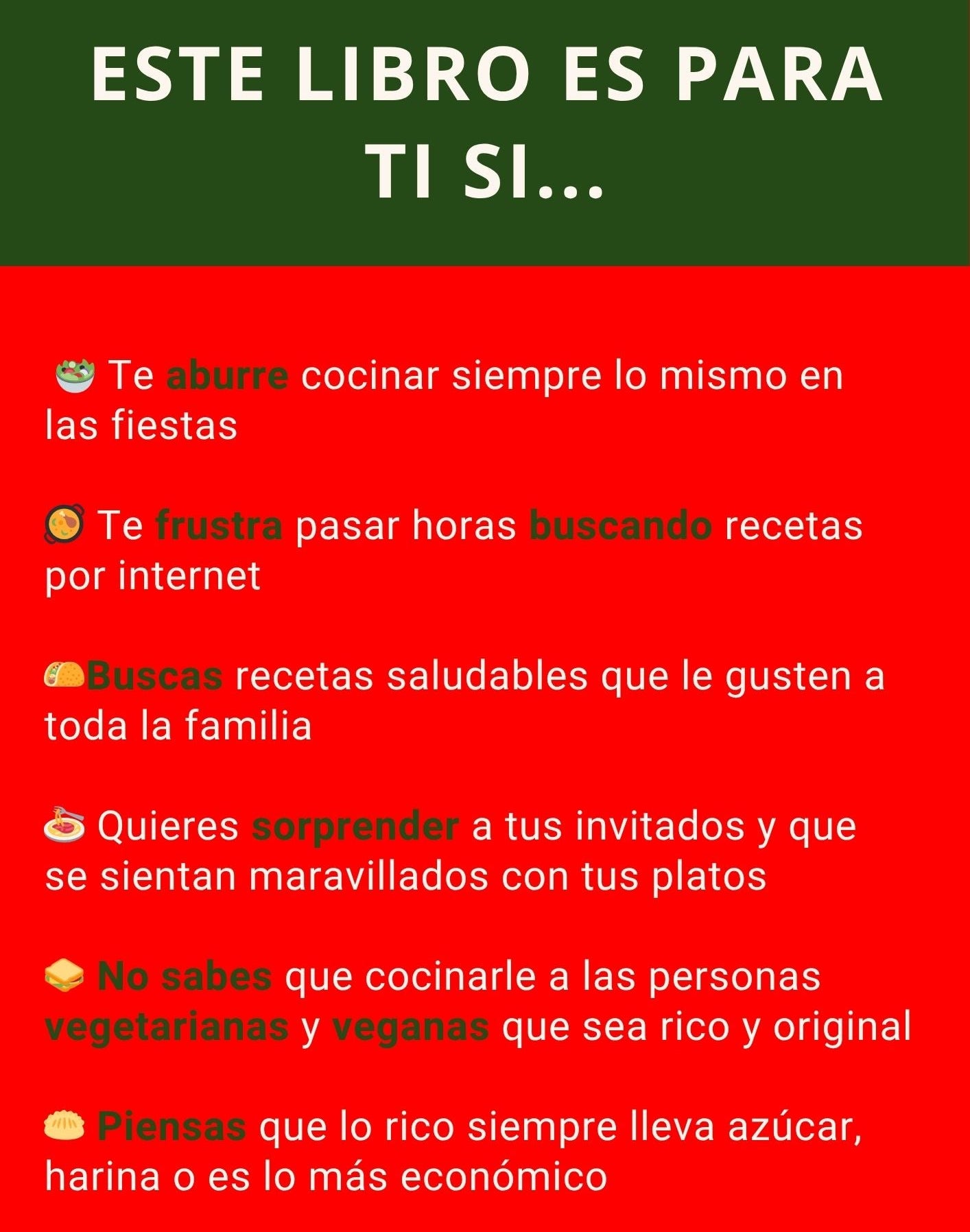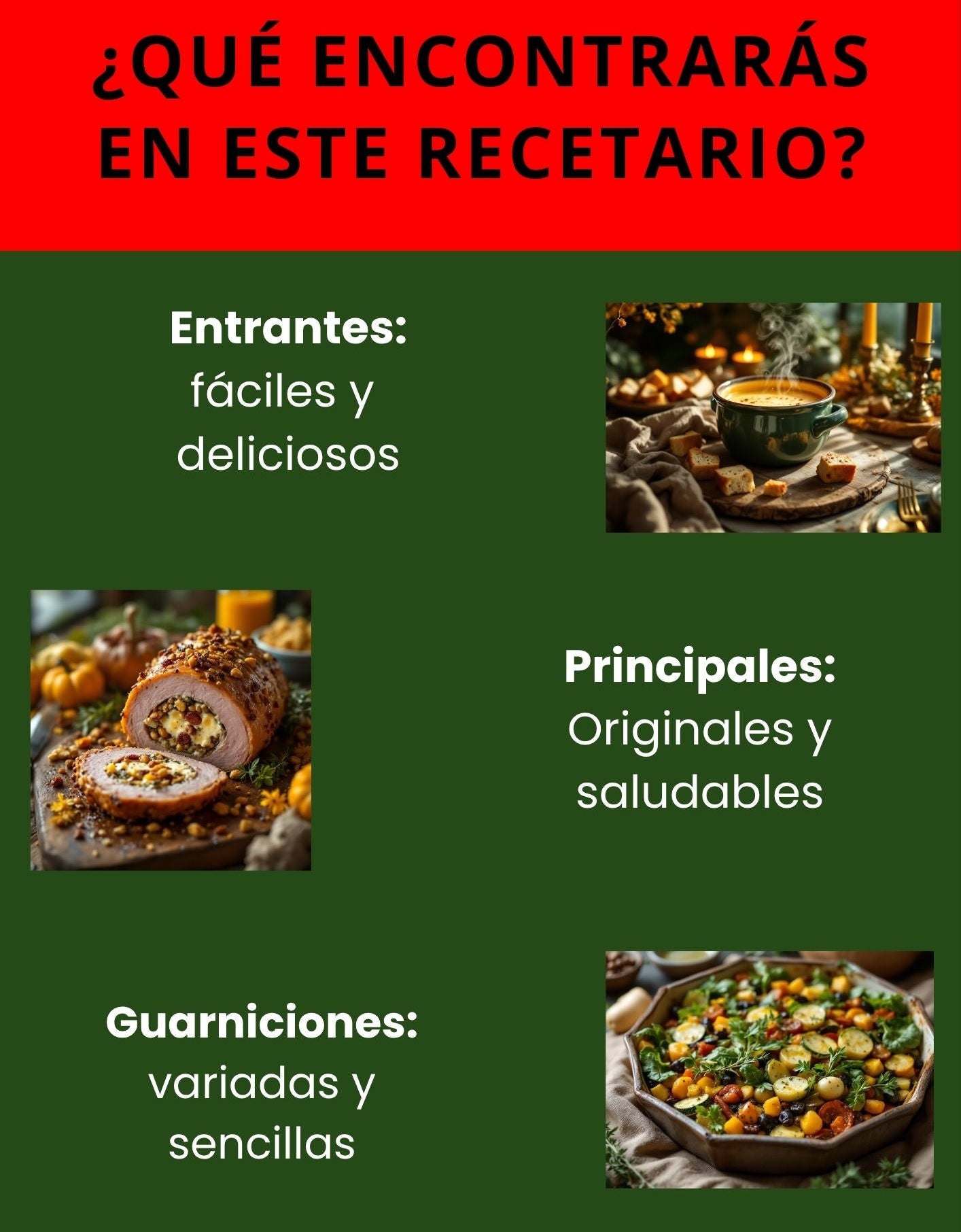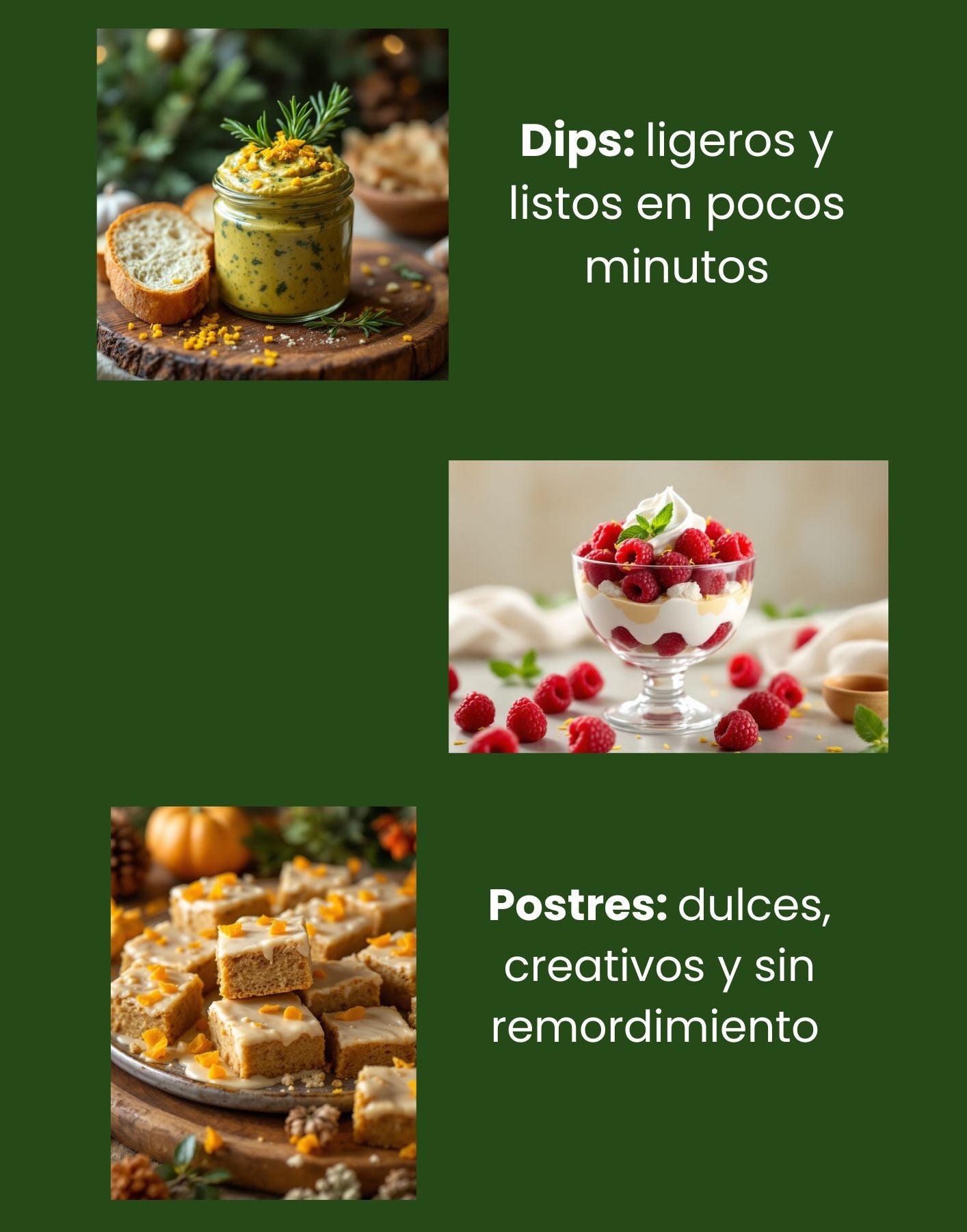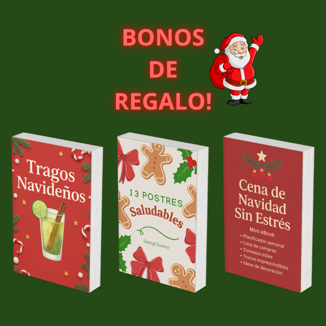 🎄 El recetario está dividido en categorías: entradas, principales, guarniciones, postres, dips y más. Hay recetas veganas, vegetarianas y carnívoras, frías y calientes, dulces y saladas, para todos los niveles de cocina. Son creaciones originales, modernas y festivas, perfectas para sorprender estas fiestas.